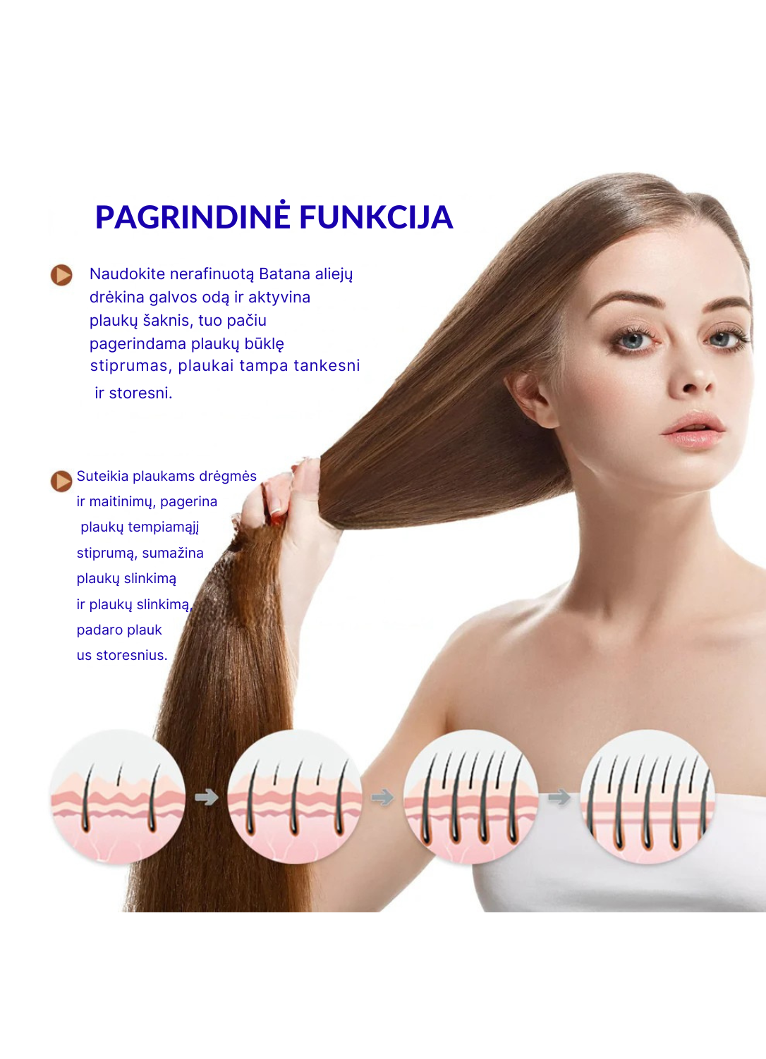 Avasta 100% rafineerimata batanaĂľli â vĂľimas vahend, mis niisutab peanahka, toidab juuksejuuri ja aitab vähendada juuste väljalangemist. Regulaarsel kasutamisel muutuvad juuksed paksemaks, tugevamaks ja läikivamaks.